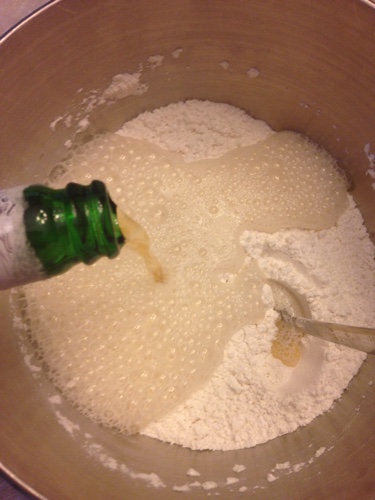 Slowly pour in can of beer. Stir until it is mixed well. It will be really sticky at this point.