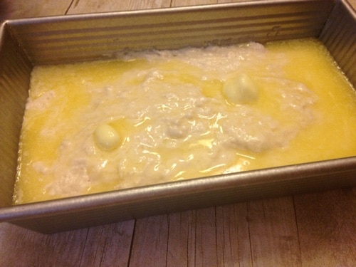 Pour into a greased bread loaf pan. Put 1/4 cup butter in a microwave safe container and microwave until melted. Pour butter over the beer bread batter.