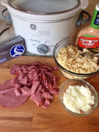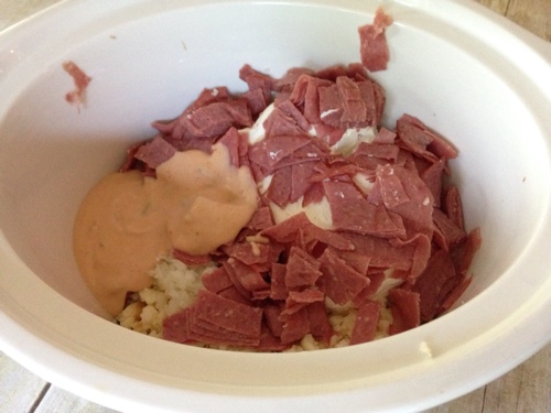 Add the cheeses, onion, thousand island dressing and the meat to the crock pot. Place on low heat for about 1-2 hours. Stir every 15-20 minutes to make sure your cheese doesn't start to burn.