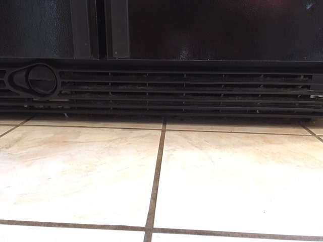 You will want to start by turning off the power to the fridge. You can either unplug it or just turn it off at the breaker. My cord is hard to reach, so I just turn off the breaker. Then you will want to remove the panel at the bottom of your fridge so you can access your coils. If yours is anything like mine it has dust, dog hair, and stuff spilled on it.