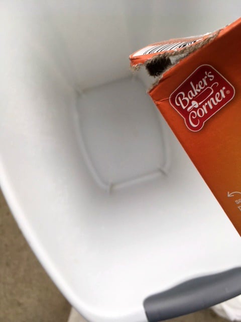 Start out by wiping down or dumping out the inside of your trash can to get any smaller trash or paper that has fallen down into the can. I almost always find a fortune from a fortune cookie in ours. Then take your trash can to an area where you can really wash it out. I don't like to do this in the sink because I think it's kind of gross. I prefer to take it outside. Because you are using vinegar you will want to make sure you use it away from any plants or grass. I usually prefer cleaning trash cans in a rock bed or my driveway.