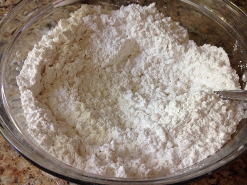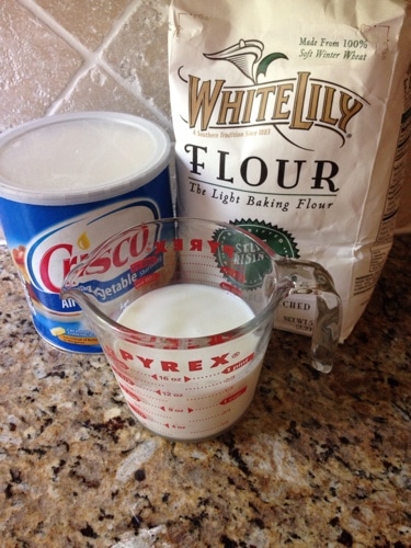 Start by mixing 4 cups self rising flour and 2/3 cup vegetable shortening together in a bowl. You will want to make sure you get rid of any large clumps of shortening.