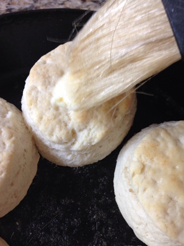 Bake biscuits in the oven at 450 degrees for 8-10 minutes. Remove from the oven when they are turning a golden color and brush them with melted butter.