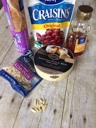 You will need a roll of crescents, small round of brie (Aldi usually sells theirs for $2.99) honey, sliced almonds, and dried cranberries.