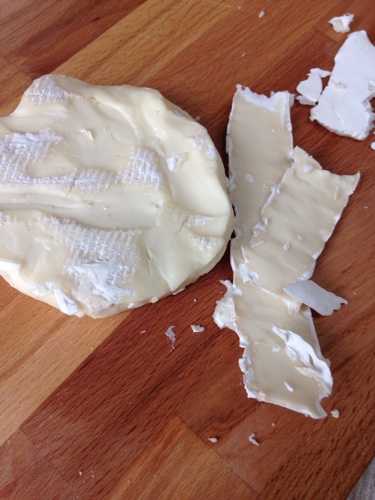 I start by taking off the outside layer of the brie. Some people like the flavor, some don't. My son and I fall into the don't category. So, I just take a few minutes and cut some of it off. It doesn't have to be perfect, your cheese will look very ugly here. That's okay, you won't notice once you wrap it.