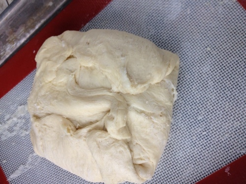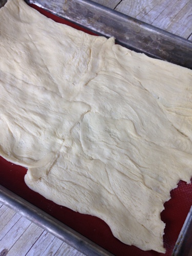 Once you have the cheese cleaned off, take out the crescents and lay them on a baking sheet. I like to use a silpat mat on a pan. Press the crescents together so you have one big crescent dough.