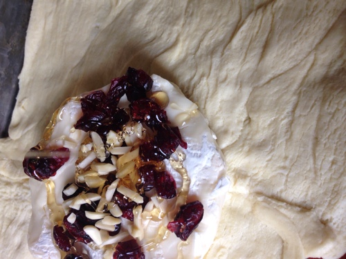 Place the cheese round in the center of the dough. Add about a tablespoon of dried cranberries and sliced almonds on top of the cheese. Then drizzle some honey over it.