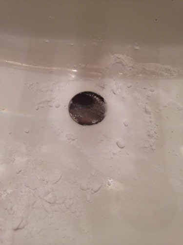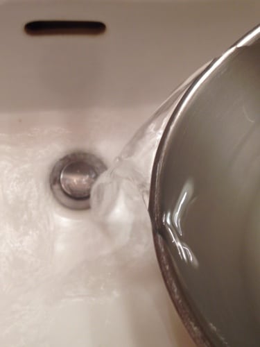 Let the mix set for about 30 minutes. Open the pop-up section or remove the plate and pour some hot water down the drain. I heat my water up on the stove to get it really hot.