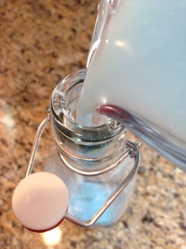 Add the vinegar/conditioner mixture to your storage bottle. I love these bottles from Amazon. They work great for any homemade cleaners. Then add two cups of hot water and gently shake to mix.
