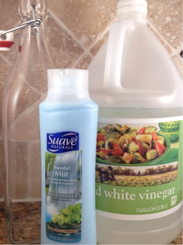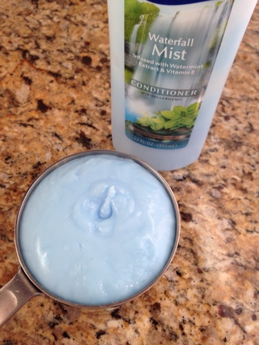 Then measure 1 cup of conditioner. I love the Suave Waterfall Mist. It smells really good, plus I can usually get it on sale for around $.50. Add the conditioner to the vinegar. It will be lumpy at first, but stir until it is well mixed.