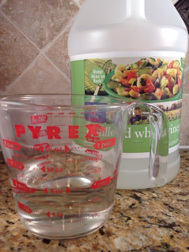 Take a large bowl or measuring cup and pour 1 cup of white vinegar into it.