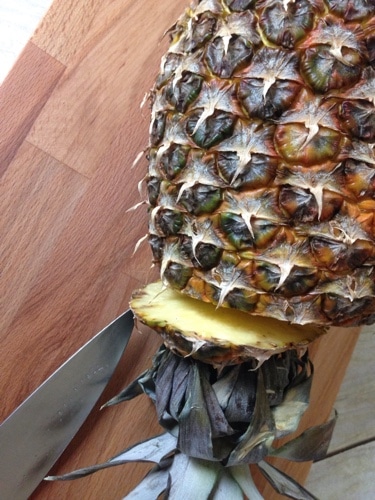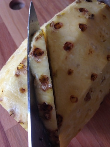 You will then want to start cutting off the sides of the pineapple. Don’t go so deep that you remove the eyes of the pineapple. The fruit right under the skin is where it is the sweetest.