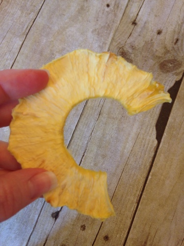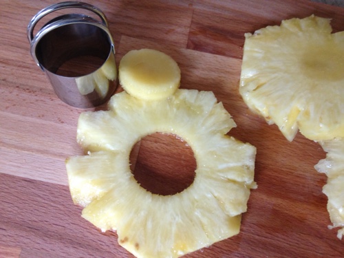 I removed the center of the pineapple slices. They can often be very tough and chewy. To remove the center I just used a small biscuit cutter. It easily sliced right through the pineapple and I could discard the center.
