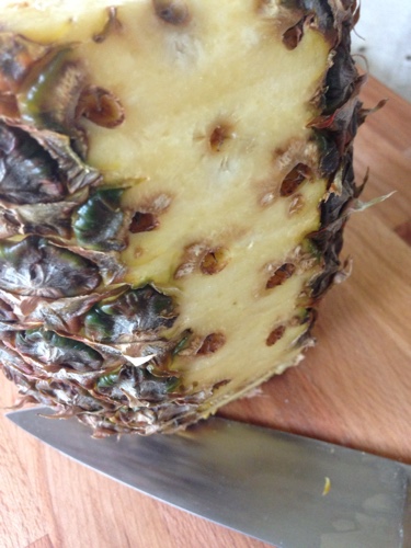 Once you have removed all the skin you can start working on the eyes. Usually you will find the eyes make a spiral pattern around the pineapple. You can easily cut away a line and remove the eyes without removing much of the fruit. I use a V pattern to remove the eyes.