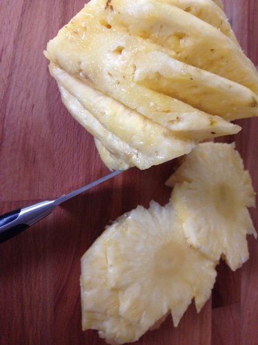 Once you have all the eyes removed you can cut the pineapple into slices. I sliced them to be about 1/4 inches.