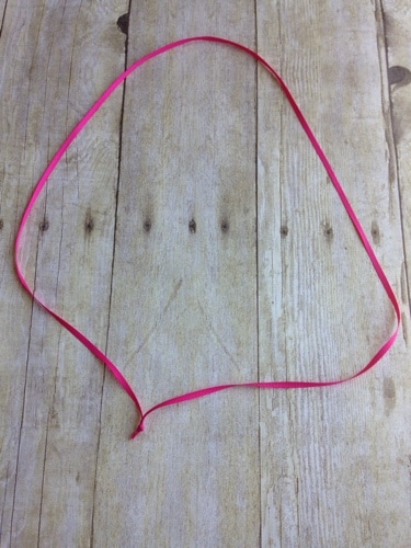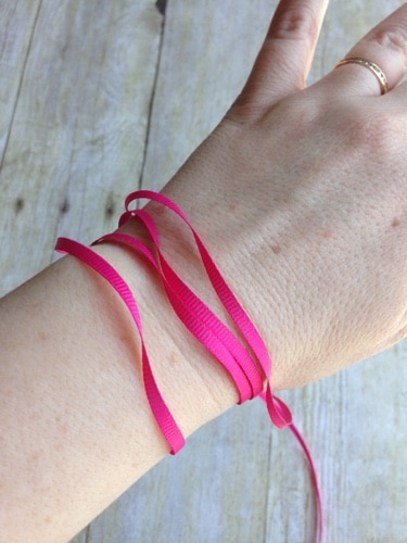 I started with some thin pink ribbon. Meijer sells it for between $.79-$.99 for a big roll. I wanted something girly, but if you are going to make bracelets for everyone in your family you may want to pick a more neutral color. I wrapped the ribbon 4 times around my wrist. Then I cut the ribbon off and tied the two ends together.