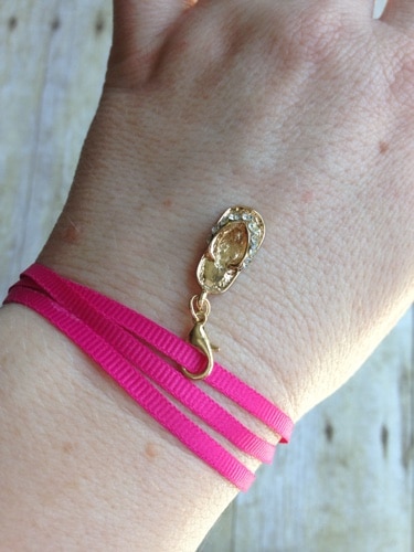 It now will look like a big necklace. I bought a small little clip on charm for my bracelet. I picked out a little flip-flop because really I would love to be at the beach every day! I picked this one up for $1.49. I just clipped it onto the ribbon.