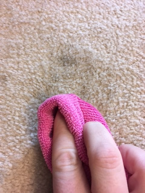 Spray the carpet stain remover over the areas of your carpet with the stains. Let it sit for about 2-5 minutes and then start to blot the stains away with a dry microfiber cloth. Make sure you are pressing firmly on the stain, but not rubbing back and forth. If you rub too hard on the carpet you will tear up the carpet fibers. If the stain doesn't go away after a minute or two of blotting repeat the steps again.