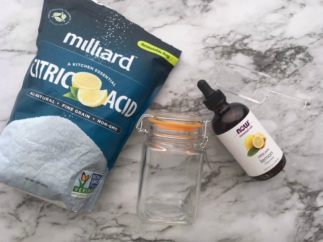 Add about 2 cups of the citric acid to the food processor and then add about 10-15 drops of the lemon essential oil. Citric acid helps fight limescale and hard water buildup on your dishes and lemon essential oil gets rid of greasy build up and helps with hard water.
