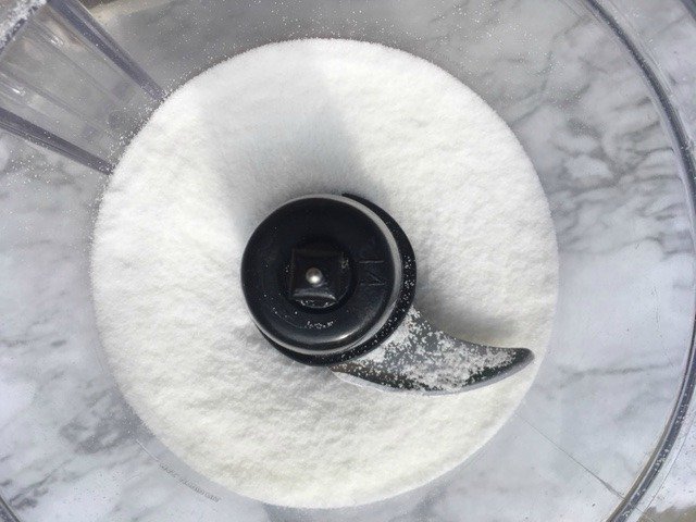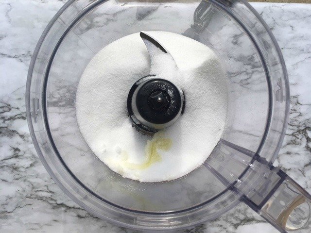 Once you have added the lemon essential oil pulse the food processor a few times or mix for about 5-10 seconds or until the essential oil is all mixed in. You can see below the food processor helped mix in all the lemon essential oil without it getting clumpy.