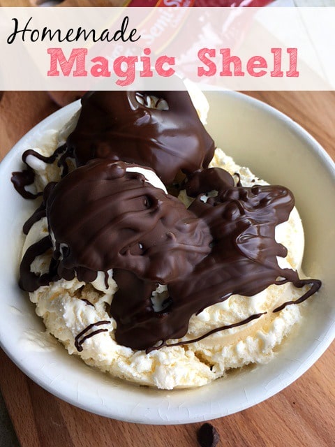 To make the homemade magic shell I changed a couple of things to make the recipe a little more frugal and we love it. It delivers just as much fun and deliciousness that I remember magic shell having as a kid.