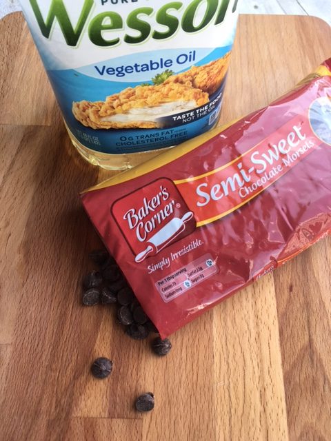 Once the chocolate chips are melted add 2 tablespoons vegetable oil and stir well to mix.