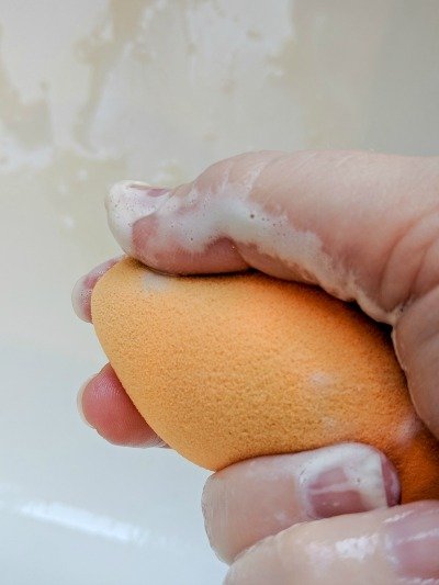 Run the beauty blender under warm tap water while gently squeezing until the water runs clear. This may take a few minutes to do, but you want to make sure that soap and oil don't get trapped in the beauty blender.