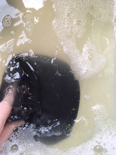 Rinse the cap in warm water until the water is clear with no soap bubbles. Then lay the hat out to dry on a clean towel. You will want to make sure the cap keeps its shape as it dries so you may want to put something under the cap. I used a large round tupperware so it held its shape. You can see below how much better it looks after being washed.