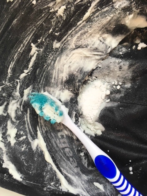Then, take a soft-bristled toothbrush and gently scrub around the bill and inside of the ball cap. You want to really get the mix in there. Next, sprinkle about 1/4 cup baking soda on the baseball cap and mix that in with the toothbrush. Once all the baking soda is mixed in let the cap sit for about 5 minutes. The dawn soap will get rid of body oils that are in the material and the vinegar and baking soda will help get rid of any funky smells the hat may have.