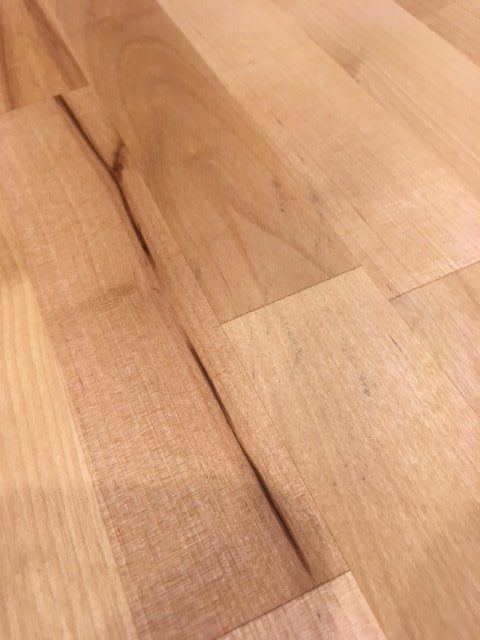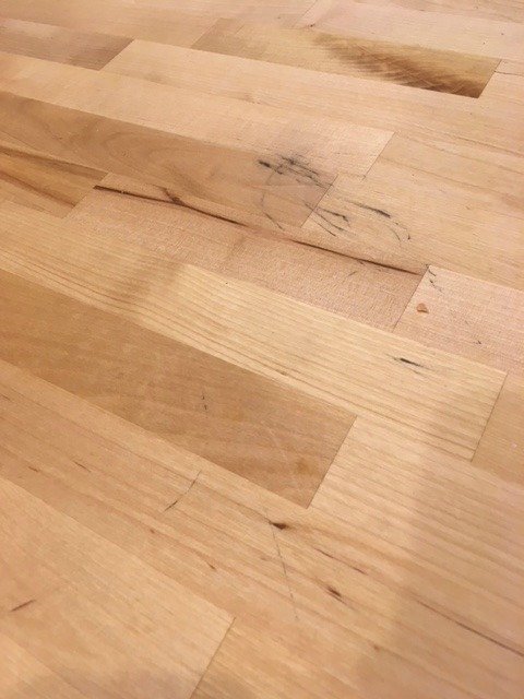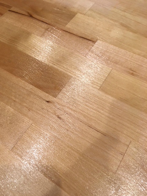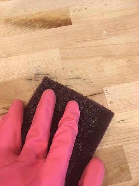 To remove any stains you will want to lightly sand the butcher block. I recommend using a very light grit sandpaper or a scotch brite sanding pad. I use this one from Amazon. You can see below I had marks across my butcher block where I blew a candle out and the soot went everywhere.