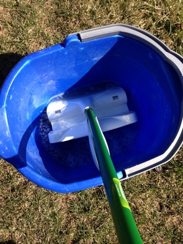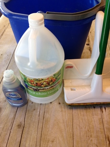 You will need Dawn soap, vinegar, water, a mop or way to scrub the window. I have a Libman mop that I love. If you don't want to use your mop you can get a great tool off amazon for around $10 here. I use 8 cups of hot water, 1 cup vinegar, and 2 teaspoons Dawn soap. Add them all to a bucket and use the mop to mix it up. If you have a lot of windows to do you may want to mix up a double batch.