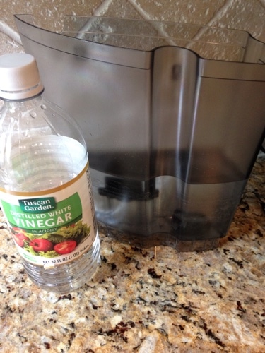 Start by filling up the water container on the Keurig with vinegar. I like to fill it to at least halfway, but make sure the vinegar covers your water rings. Then let it sit for about 20 to 30 minutes.