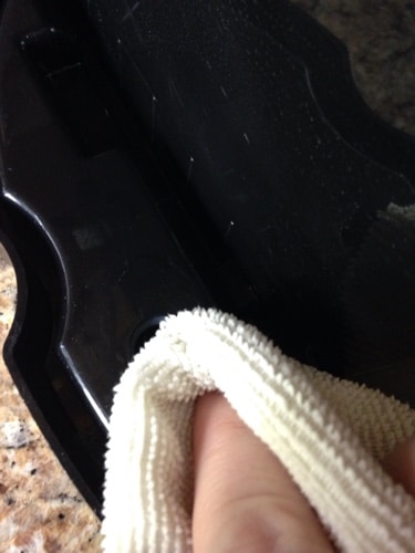 While the vinegar is sitting, get a cloth and pour some vinegar on the cloth. I just use a microfiber cloth to prevent lint from getting in the Keurig. Wipe down and clean your Keurig on the outside. I usually get some buildup where the water container attaches to the Keurig. Wiping it down with the vinegar helps get rid of it.
