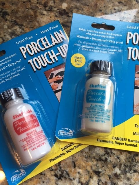 You will need to start with a porcelain sink repair kit. I bought this one and this one from Amazon. If you have a bright white sink you can just buy the white kit. Because our sink was a cream color instead of bright white I bought the white and an almond color.