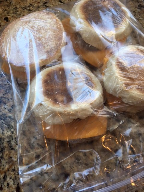 After assembling them you will want to wrap them up well so they don't get freezer burn. I used plastic wrap to wrap them up and then stored them all together in a freezer safe ziploc. It keeps them all together so you don't have any lost breakfast sandwiches in the freezer and it gives you a double layer of protection against freezer burn.