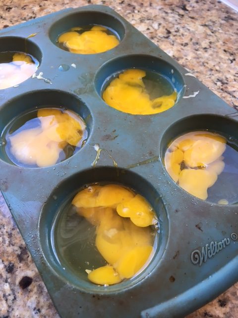 Start by cooking the eggs. I recommend using a muffin tin to cook them in. Just heat your oven to 350 degrees and then crack one egg in each spot. Add a dash of salt and pepper to each and break the yolk. Cook them in the oven until the eggs are set, about 13-15 minutes.