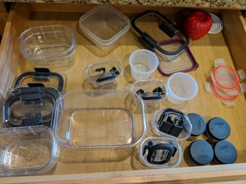Throw out any containers without lids or vice versa. If you have any food storage containers that you just never use donate those.