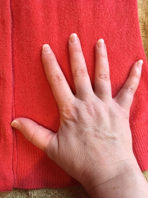 Place the clothes on a dry, clean towel so you can stretch the clothes. Placing your hand on one side of the clothes to hold it in place gently stretch in the direction it needs to be stretched. For my sweater, I was trying to add some length but not width so I only stretched up and down.