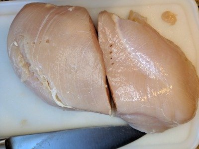 You will want to start cutting off any of the fat or parts of the chicken breast or meats that you don't want on there. I am pretty picky so I remove almost any little bits of leftover fat. Then cut them into the portion sizes you want. I like to cut the large chicken breasts in two, but if you like tenders you can cut them down into even smaller pieces.
