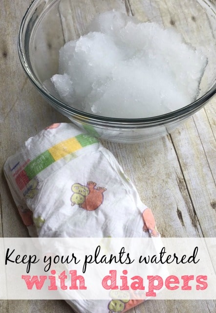 For the cost of a diaper (under $.50) you can easily keep a couple of plants watered for a week or two. If you are planting a bunch of new plants a small pack of diapers will keep your plants watered. Keep your plants looking great all summer long with this easy and inexpensive garden hack.