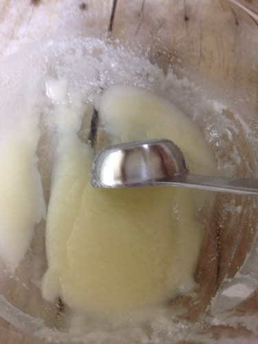 Add in 5 tablespoons of olive oil to the bowl and stir well. When it is mixed, add 5-10 drops of lavender essential oils.