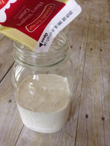 Just pour the heavy whipping cream in the jar, screw the lid on tight and start shaking. It usually takes around 6-7 minutes before you start to notice a change. The jar will start to get a lot harder to shake. It will start to look a lot like whipped cream.