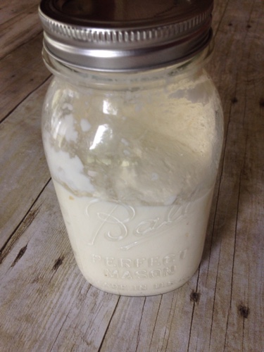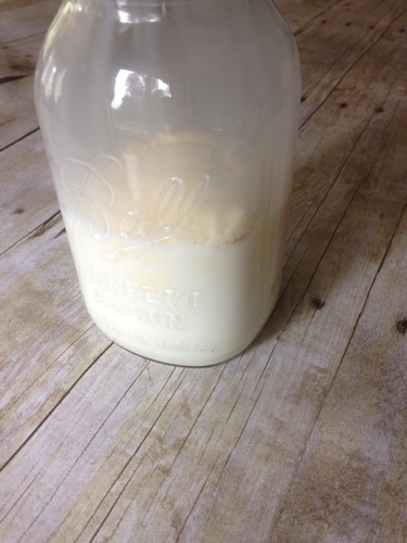 Keep shaking for a few more minutes until it is easier to shake. You will notice it turns more like a milk and you can hear the butter sloshing around in the jar as you shake it. The butter will form in a big ball and just float in the jar.