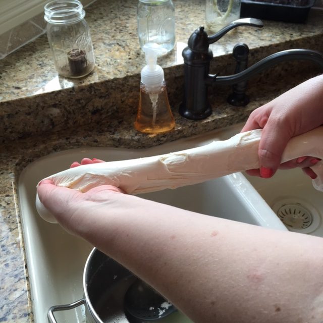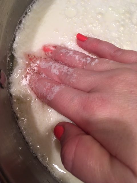 Place the curds back in the microwave for about 30 seconds. Being very careful (the curds get really hot) remove the cheese from the bowl. It should be shiny and bright and can stretch like taffy.