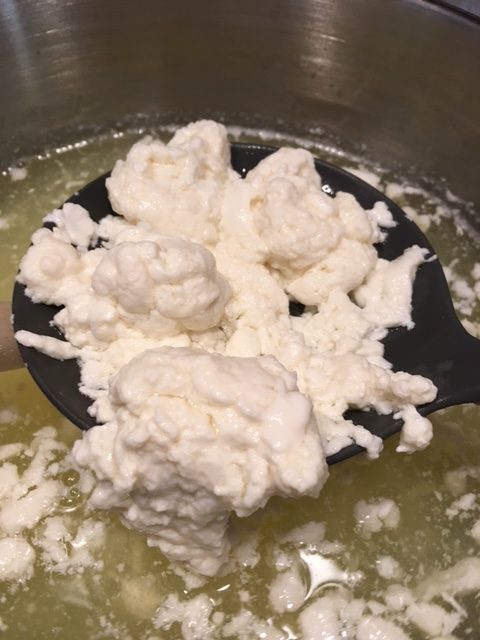 You will now have a lumpy, watery mixture. The watery looking stuff is whey. The white lumps are your curds. Separate the curds and whey. I use a slotted spoon to remove my curds. Put the curds in a microwave safe dish and place in the microwave for one minute. Remove the curds, dump out any extra water and add 1 teaspoon salt.