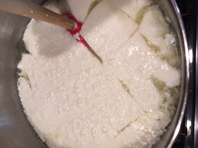 After 5 minutes curds will have formed. When you press on the white parts you can see the separation of the whey and curds. Use a long knife to gently cut the curds.