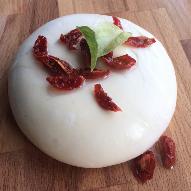 After 15 minutes you can remove the mozzarella from the water and it is ready to eat. We like to eat the mozzarella with sun-dried tomatoes, basil, and some olive oil. The difference between what we make versus what we buy in the store is night and day. I have found the stores fresh mozzarella to be grainy and sometimes almost plastic tasting. We all prefer the creamy, natural taste of homemade.