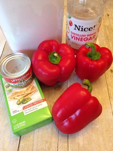 The red pepper jelly recipe is easy to make and it tastes great. To make, you need 3 large red peppers, chile peppers (I used a can) sugar, liquid pectin and vinegar.
