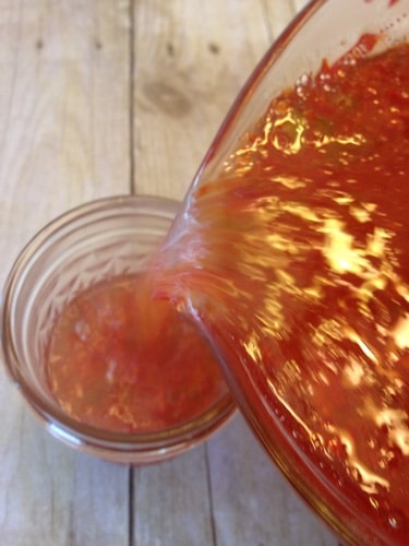 Stir the mixture for another 10-15 minutes. When the mixture gets to 220 degrees remove it from the heat and pour into canning jars. I have found it easiest to transfer the jelly to a easy pour measuring cup.