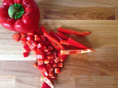 Start by washing off the three peppers. You will want to cut the tops off of the peppers and remove the stems, seeds and ribs. Slice the peppers into strips and then dice them.